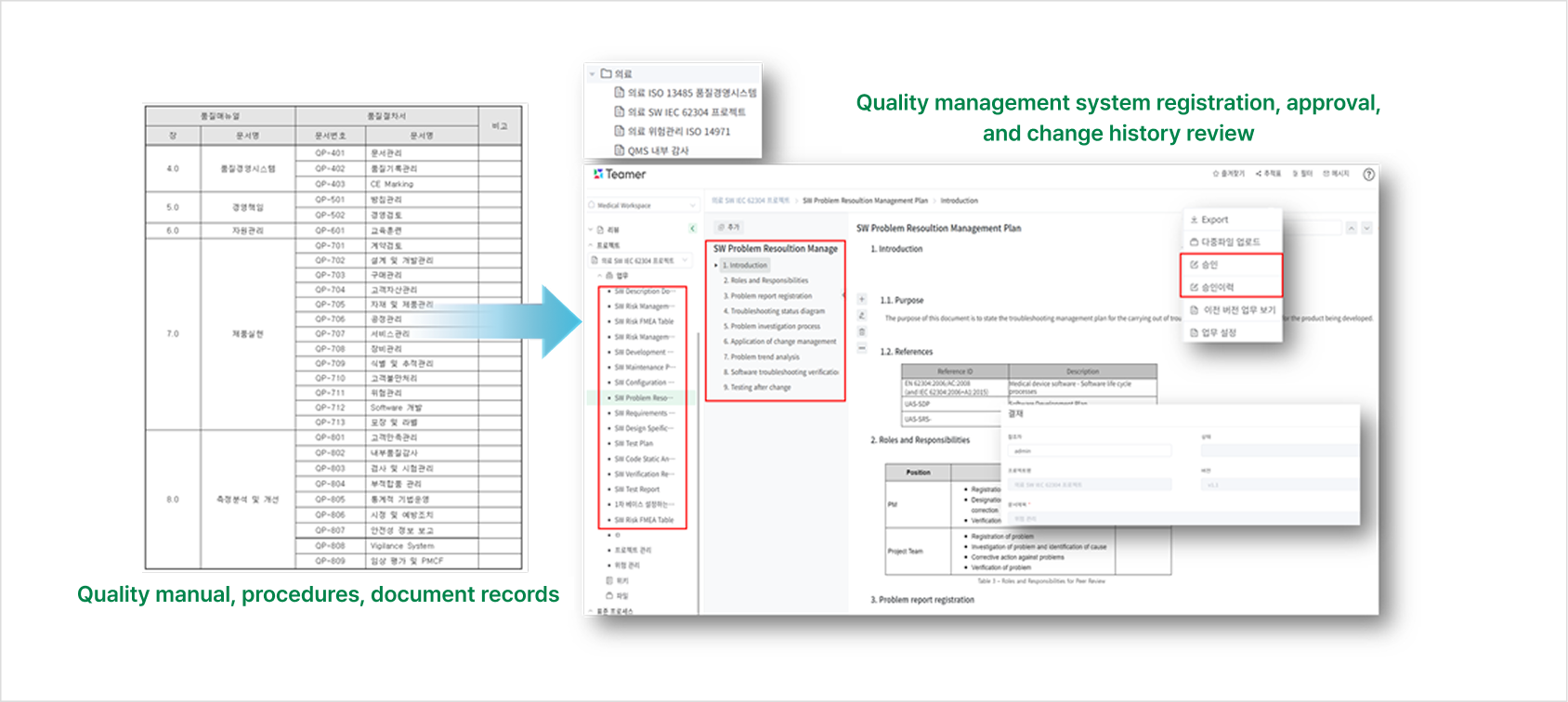 为提升质量管理效率,eQMS在 “开发、生产、测试、验证等” 过程中提供所需文档、程序和指南的综合管理功能。